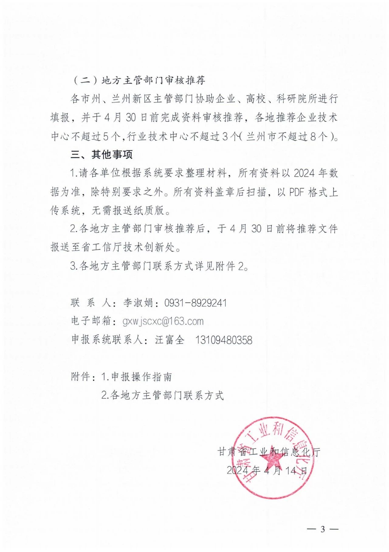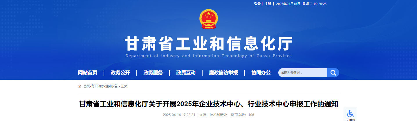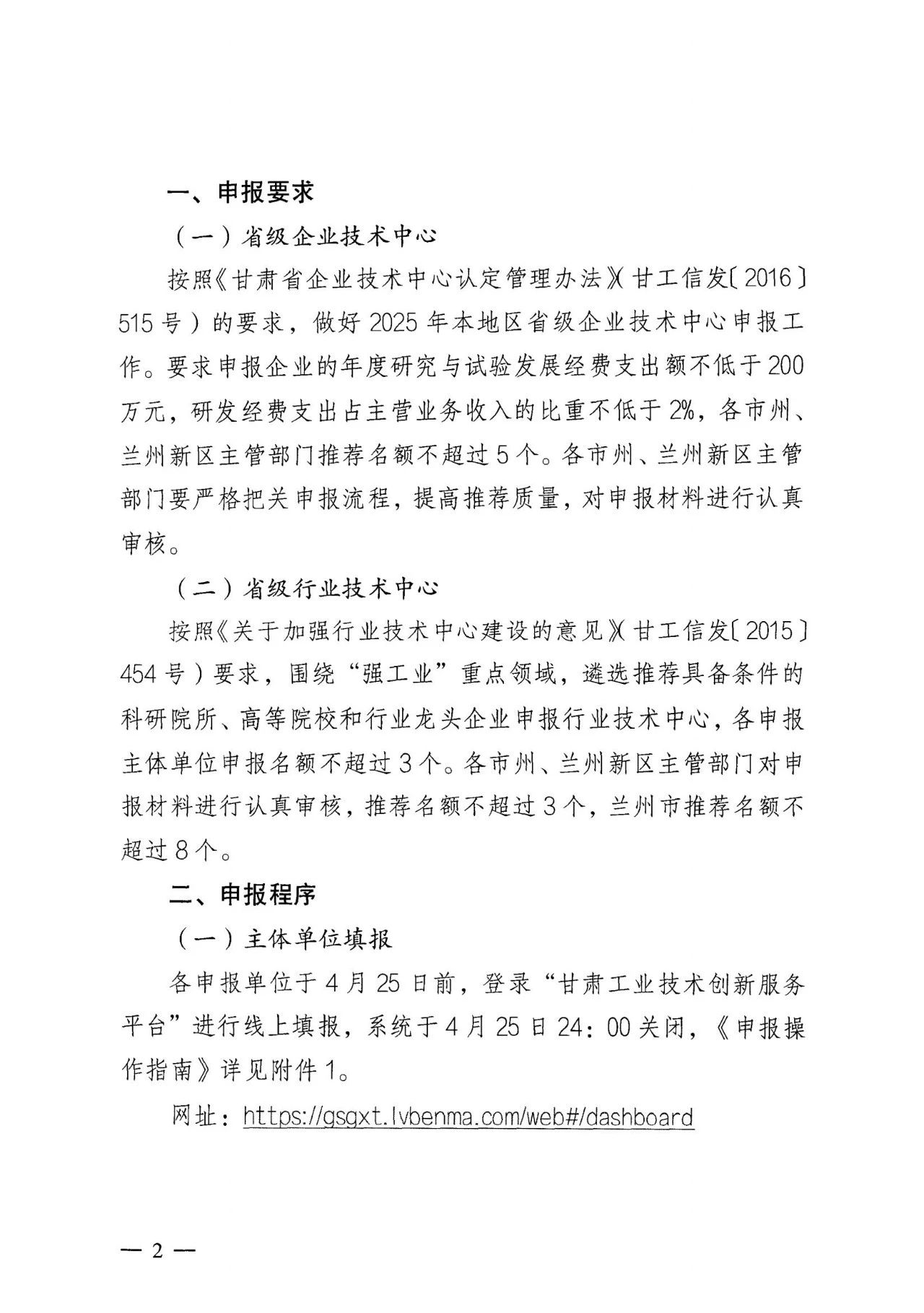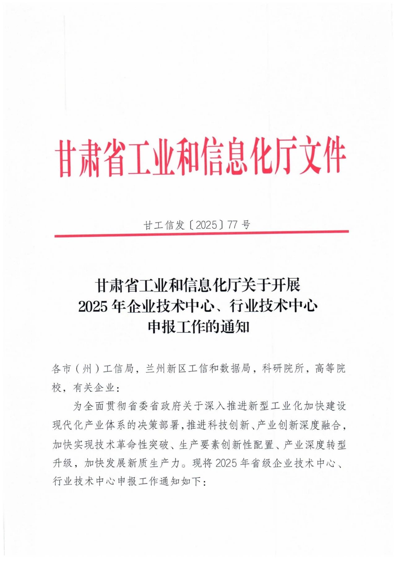 甘肃省工业和信息化厅关于开展2025年企业技术中心、行业技术中心申报工作的通知 发布日期:2025-04-17